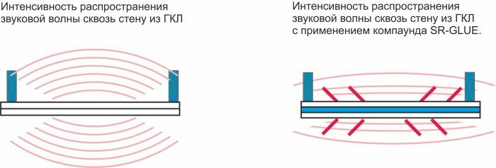 То есть, SR-GLUE представляет собой пастообразный материал, поставляемый потребителю в ведрах разного объема. Он наносится на листовые материалы из специального шприца, в который легко закачивается непосредственно из ведра. Снижение звукопроницаемости ограждающих конструкций с использованием SR-GLUE происходит за счет того, что конструкция передает меньше энергии молекулам воздуха, чем на нее пришло, за счет демпфирования большей ее части.