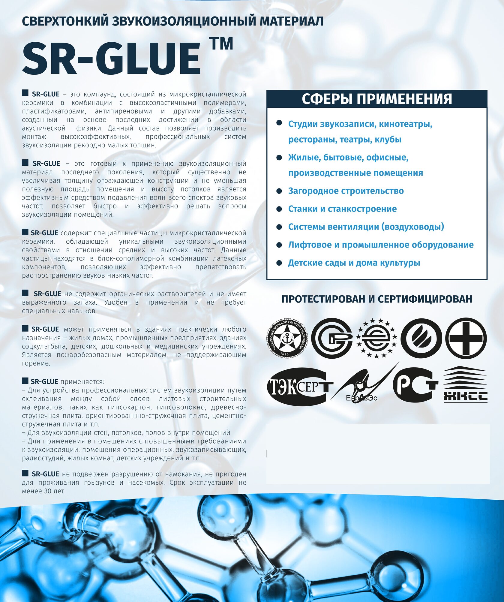 SR-GLUE – это принципиально новый подход к шумоизоляции. Данный продукт сам по себе обладает звукоизоляционными и звукопоглощающими свойствами в отношении звуков высоких и средних частот, однако, применение его в качестве демпфирующего слоя между двумя (или более) слоями листовых материалов, позволяет усилить эти свойства, обеспечивая полученной конструкции еще и изоляционные свойства в отношении звуков низких частот.