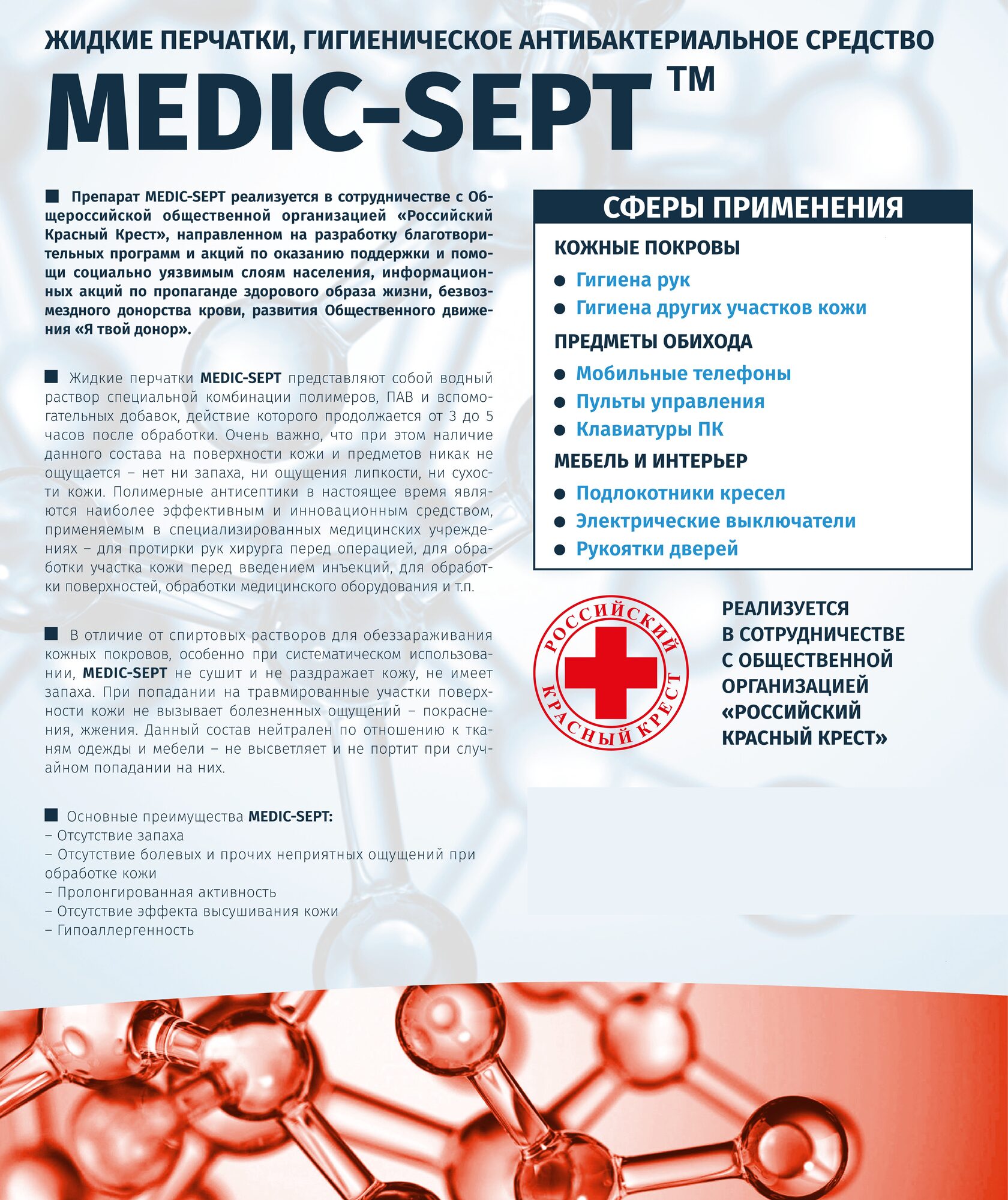 «MEDIC-SEPT™» представляет собой прозрачную жидкость (допускается слегка желтоватый оттенок) без запаха.